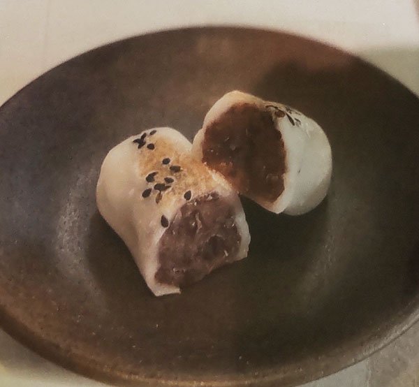 (長福寺餅...大納言小豆の粒あんとやわらかいお餅の食感、香ばしい黒胡麻。老舗和菓子屋の職人の手によってひとつひとつ作られます。)