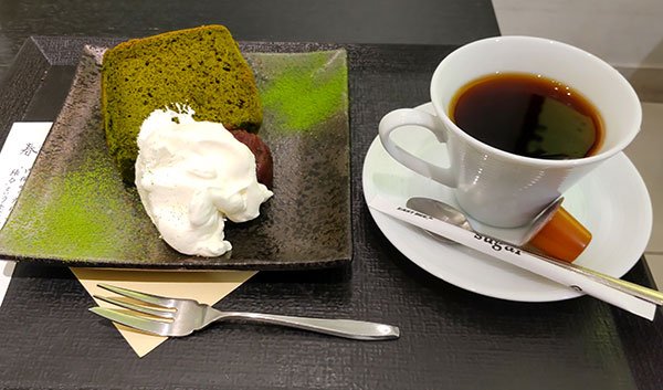 店内で焼き上げた石臼挽き宇治抹茶の香り豊かなふんわりシフォン。写真ではあんこが生クリームに隠れています。
