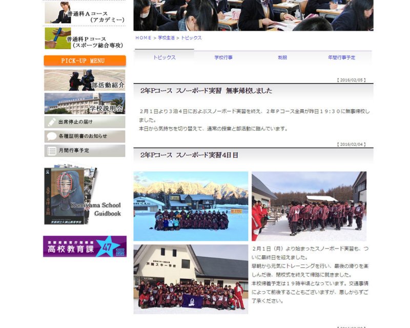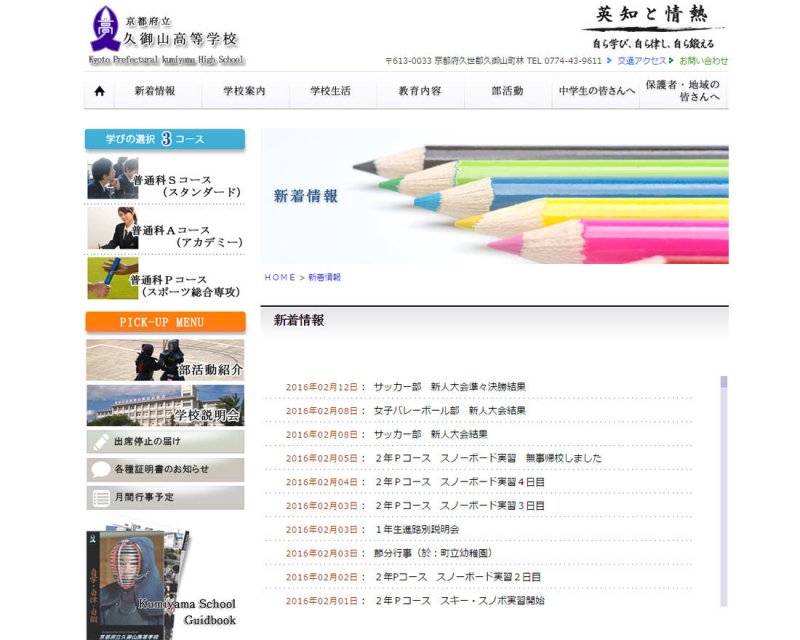 校訓である『自学(知)、自律(徳)、自鍛(体)』をかかげられ、文武両道の実践を柱としてされている京都府立久御山高等学校。 サッカーや剣道などクラブ活動にも大いに力を注がれているようで、よく大会などで学校名をみかけます。 それらの紹介もあり、各クラブ活動紹介など、誰でも簡単に記事が記載出来るよう工夫をしております。 また、画像の自動サムネイルも機能も設置しました。