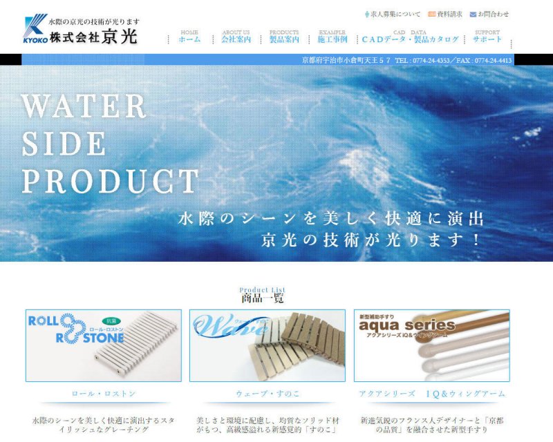 会社の「確かな製品」という経営理念と「水際のシーンを美しく快適に演出 京光の技術が光ります!」というキャッチコピーを表現するようにしました。
