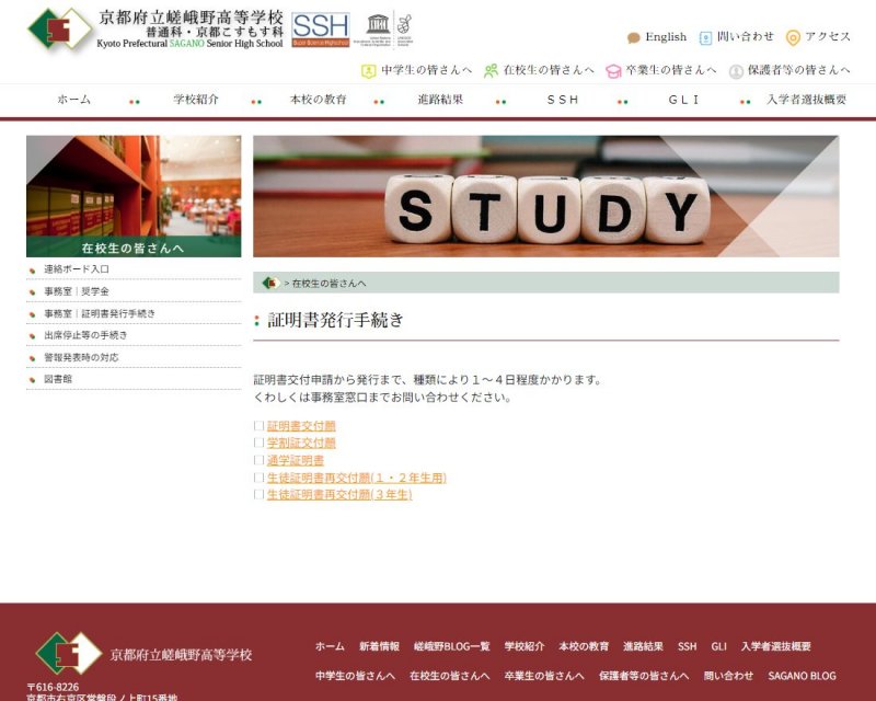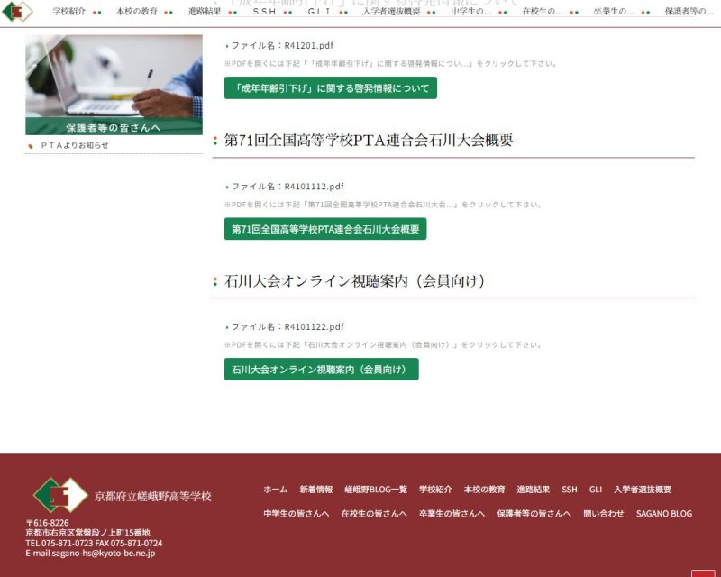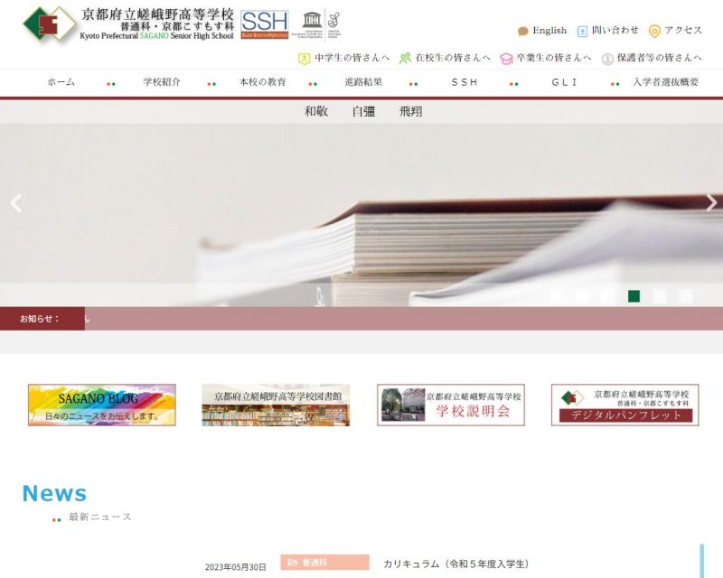 今までご使用されていたNetCommons(CMS)の変更等などに対応するため、22年春からサイト制作のお話をいただいておりました。今回、ようやくサイト公開にこぎ着けられました。サイトは嵯峨野高校の「和敬・自彊・飛翔」をイメージしたものとしております。