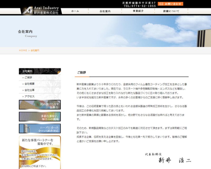 新井産業様は、金銀糸用のフィルム着色コーティング加工を主体とした事業に力を入れ、さまざまな加工を取り入れながら新たな製品づくりに日々取り組まれています。