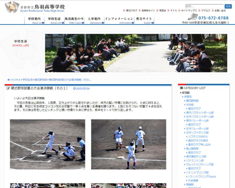 創立100周年を越える鳥羽高校は部活動も盛んな学校です。ちょうどサイトリニューアルの直後、鳥羽高校が第97回全国高等学校野球選手権大会の京都府代表となり、甲子園で活躍した事はまだ記憶の新しいところです。